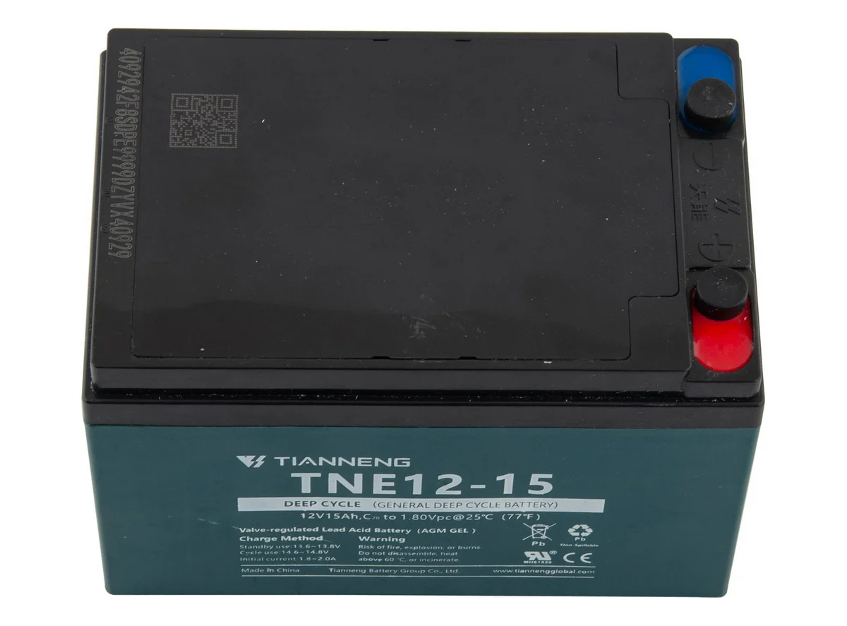 Napon baterije je 12V, kapacitet 15 amper časova. Tip baterije je AGM GEL tehnologije, olovna i namenjena je elektro biciklama. Tianneng je brend, poznate, istoimene, vodeće kompanije u svetu u oblasti nove energije, koja pruža pouzdana rešenja za baterije za sve vrste električnih vozila. Ove baterije odlikuje: snažna pokretačka moć, dug domet, visok kvalitet i prepoznatljivost širom sveta. Dimenzija baterije je 151x98x98mm, a njena težina je 3,95kg