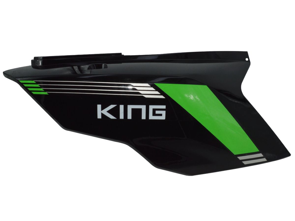 Plastični oklop za električni skuter Galaxy King. Zadnji desni panel ispod sedišta za električni bicikl King. Plastični oklop crne boje sa zelenim nalepnicama.